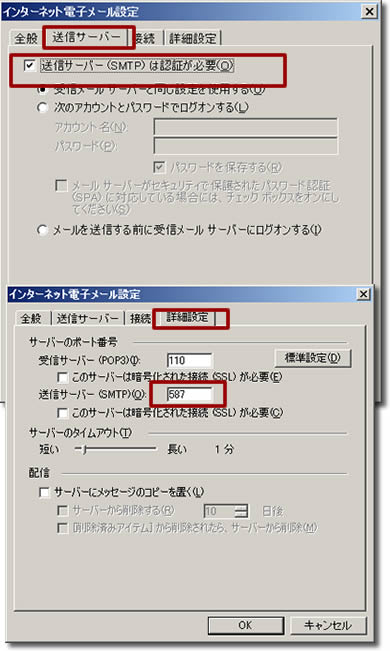 「詳細設定」タブ→「送信サーバー(SMTP)」のポートを「587」にセットする。